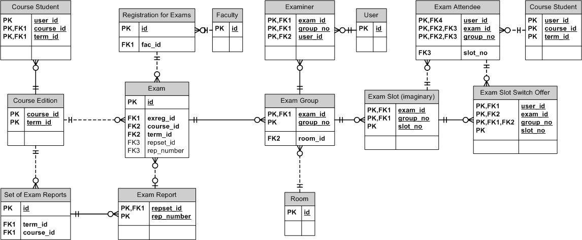 Exam Report Set, Exam Slot (imaginary), Examiner, Registration for Exams, Room, User.